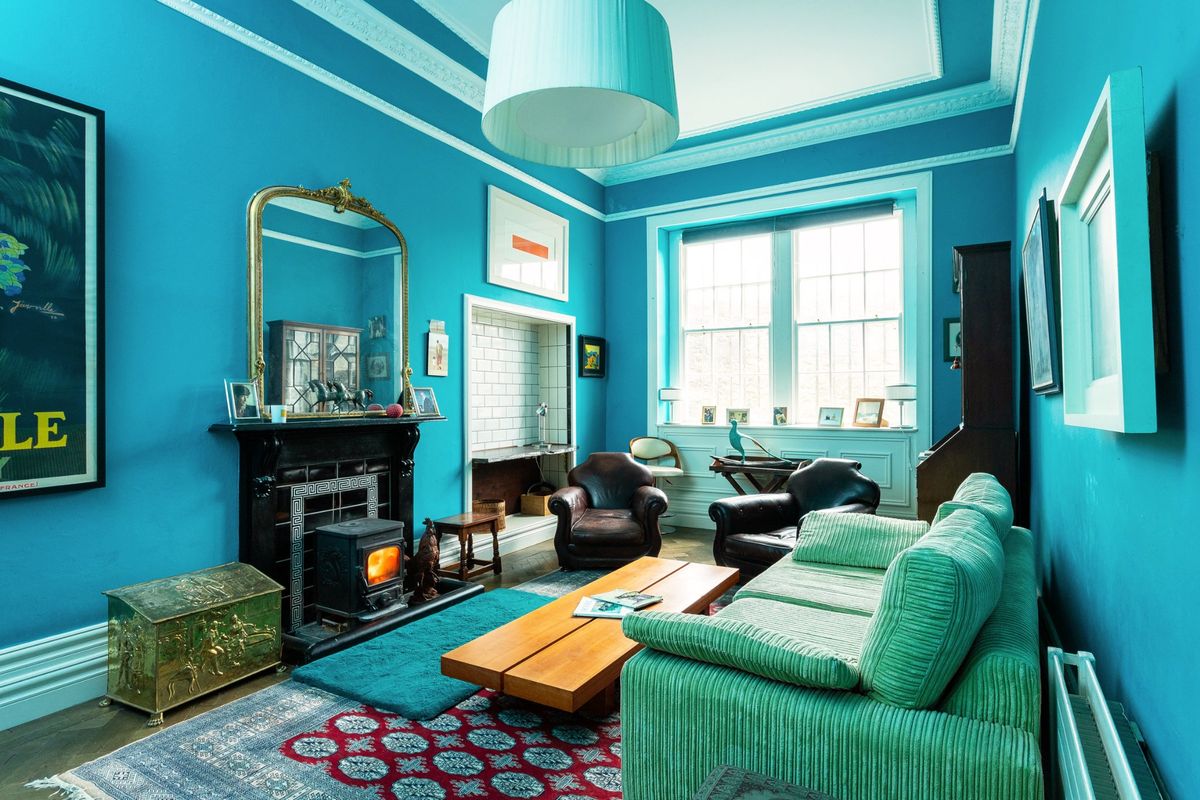 Next door, the library offers a cosy atmosphere with built-in shelving. Sliding double doors lead from this room into the beautifully light-filled drawing room, where the rich navy walls create a warm and inviting ambiance. A wood-burning stove is complemented by a stunning Adams fireplace above, making it the ideal space for entertaining.
