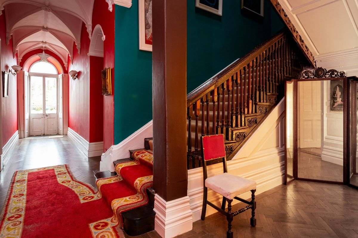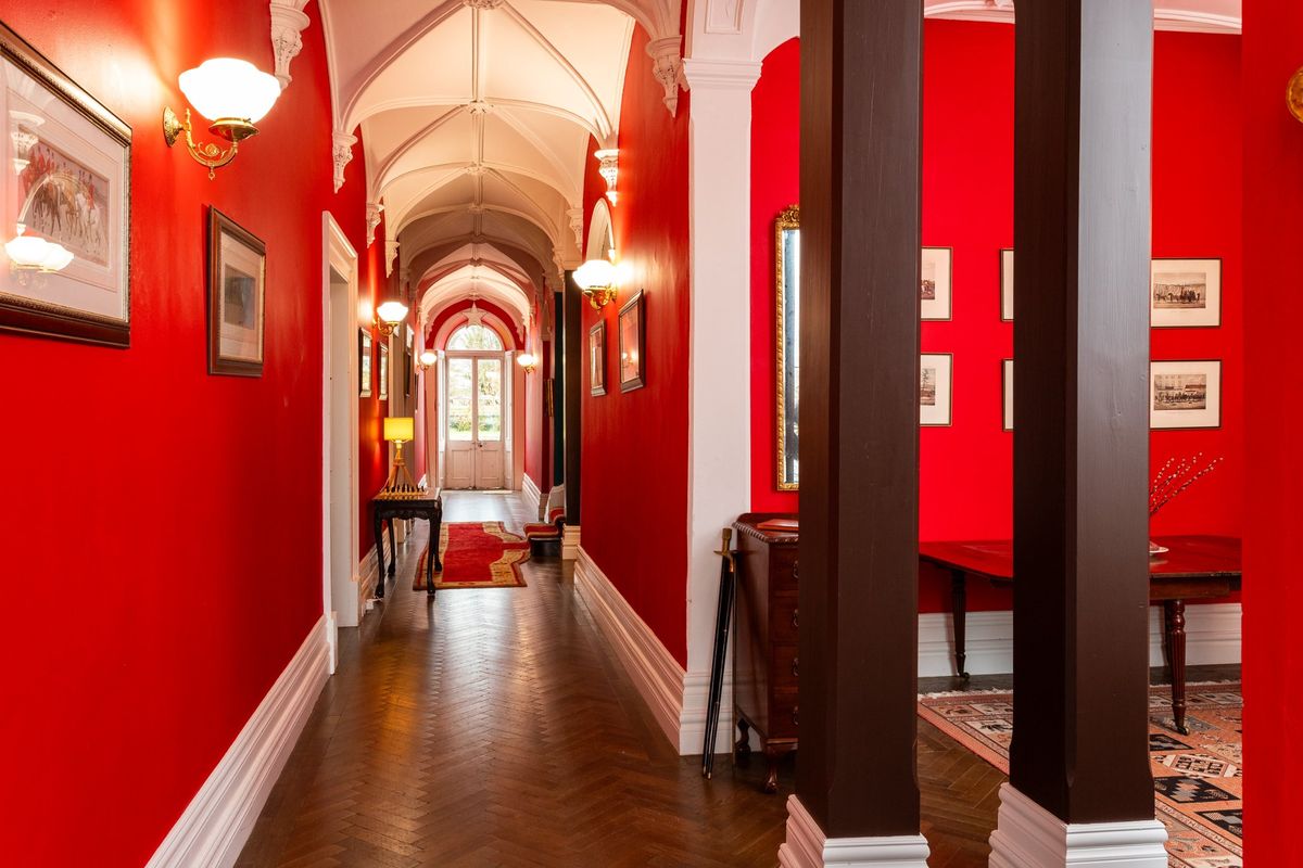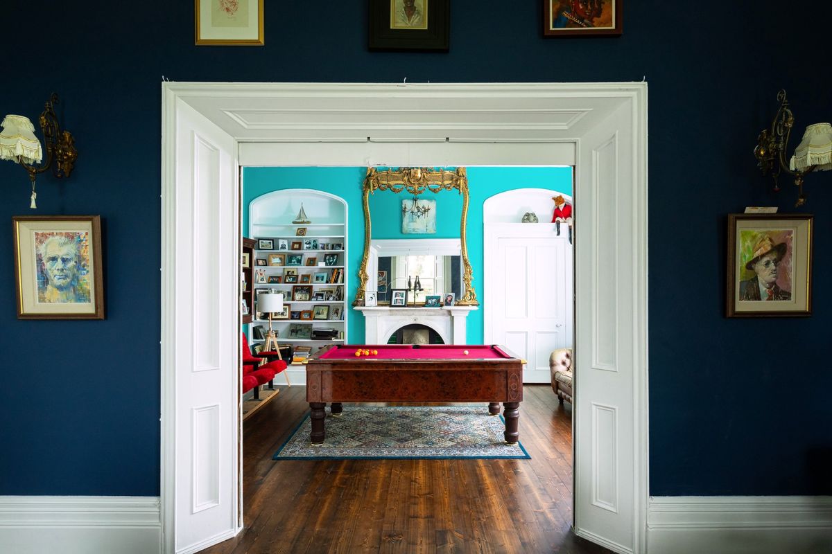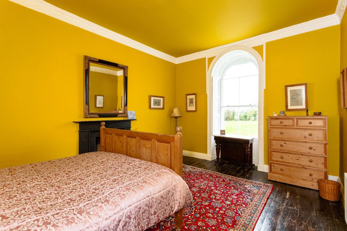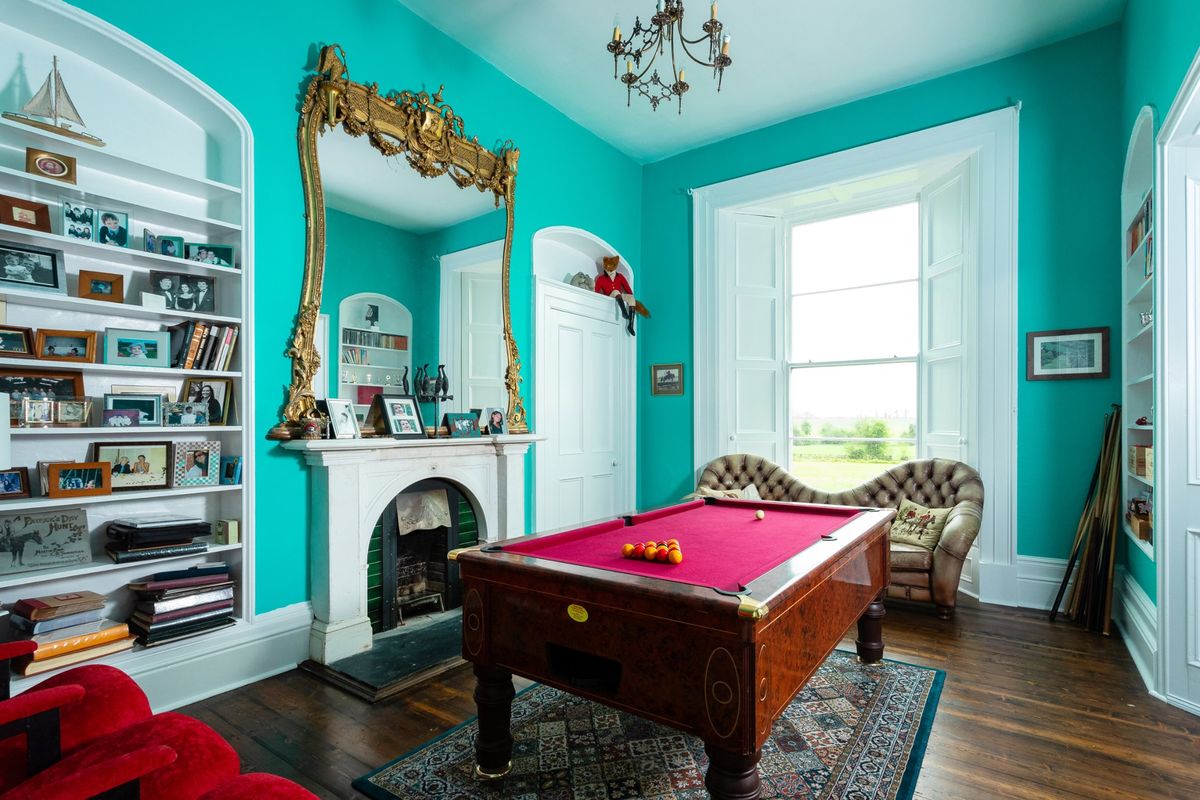 The current owners have skilfully preserved the property’s historic character while introducing a bold and vibrant colour palette that adds a modern, distinctive touch throughout the house. Upon entering Cangort House, you are greeted by a long entrance hall featuring a decorative vaulted ceiling and stunning parquet flooring, which extends into many of the rooms throughout the house. To the right is a small lobby area, and as you continue, the first reception room you encounter is the dining room. This elegant space boasts lofty ceilings adorned with intricate cornicing, solid wood flooring, a striking marble fireplace, and large mullioned windows, a hallmark of the Jacobean era.