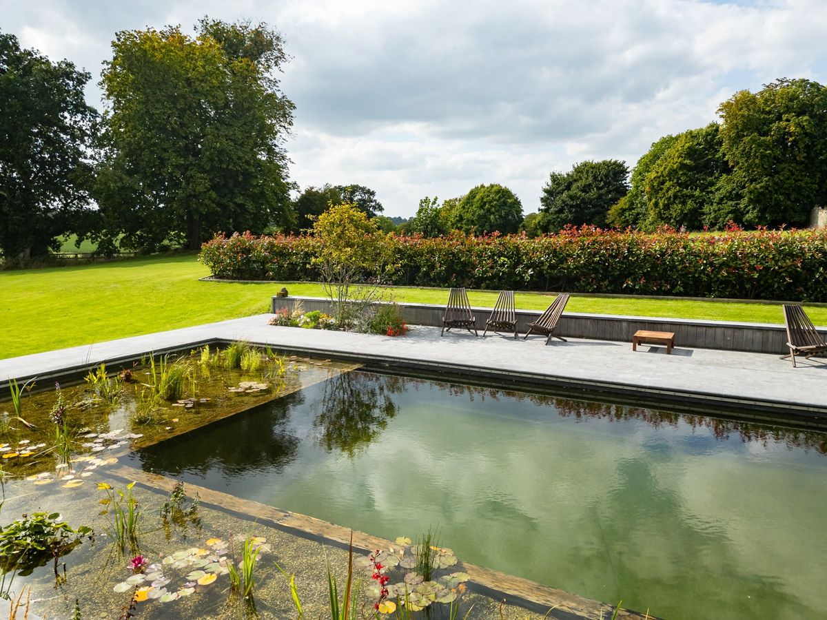 To the side of the house lies a stunning natural swimming pool, surrounded by a lush array of aquatic plants and filled with pure rainwater, free from chemicals or chlorine. This serene, eco-friendly oasis provides the perfect spot to unwind and relax amidst the beauty of the garden.