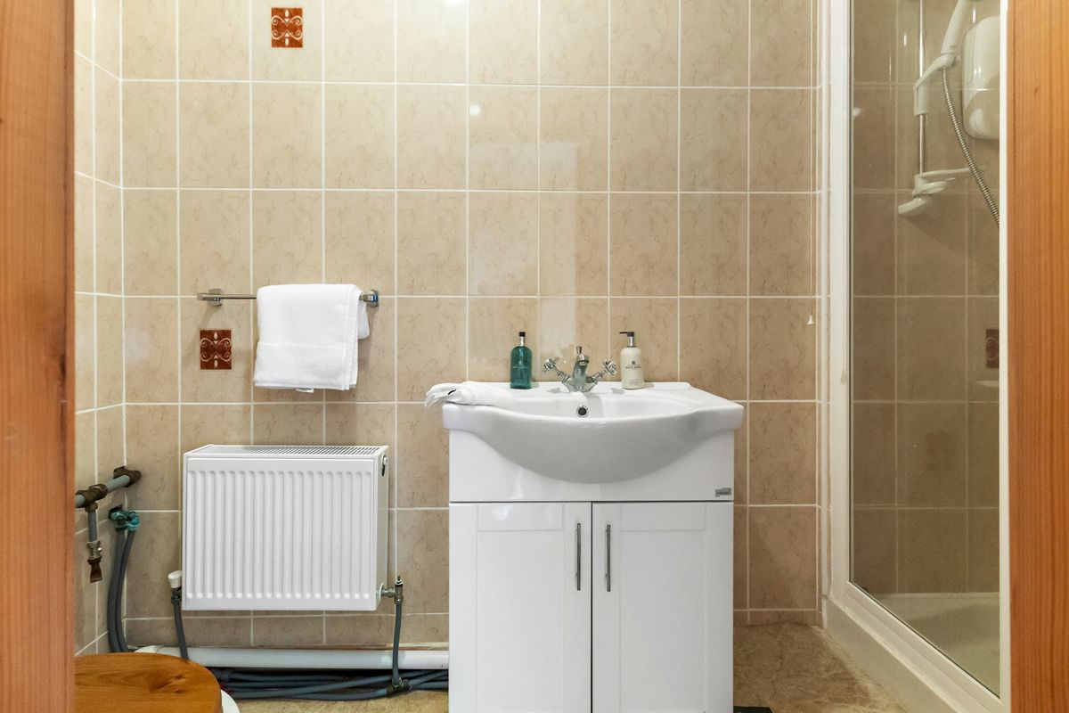 En-Suite: Tiled wall bathroom featuring w.c, wash hand basin and shower.