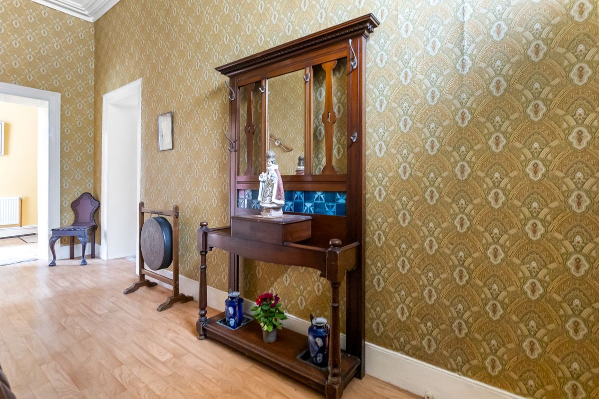 Foyer: Large elegant hallway with laminate wood flooring, coving, panelled front door with fanlight window above.