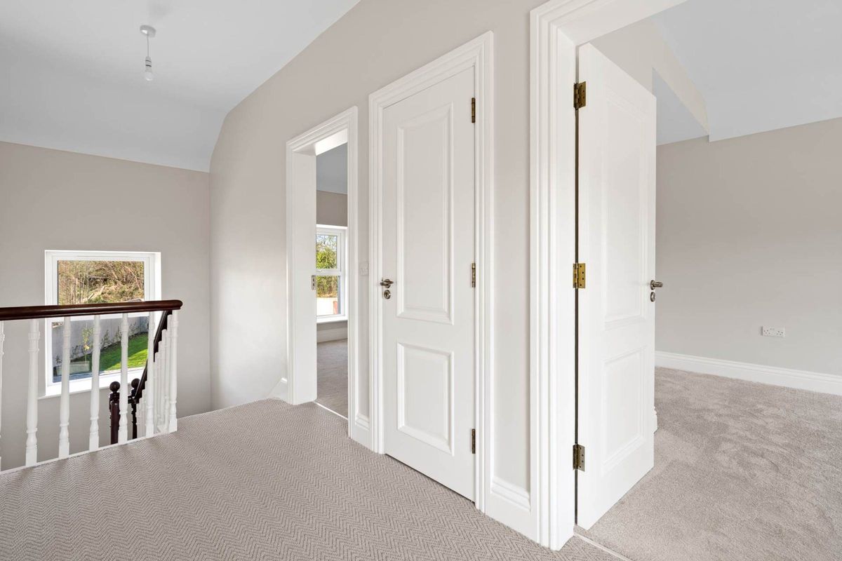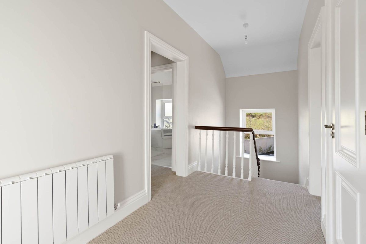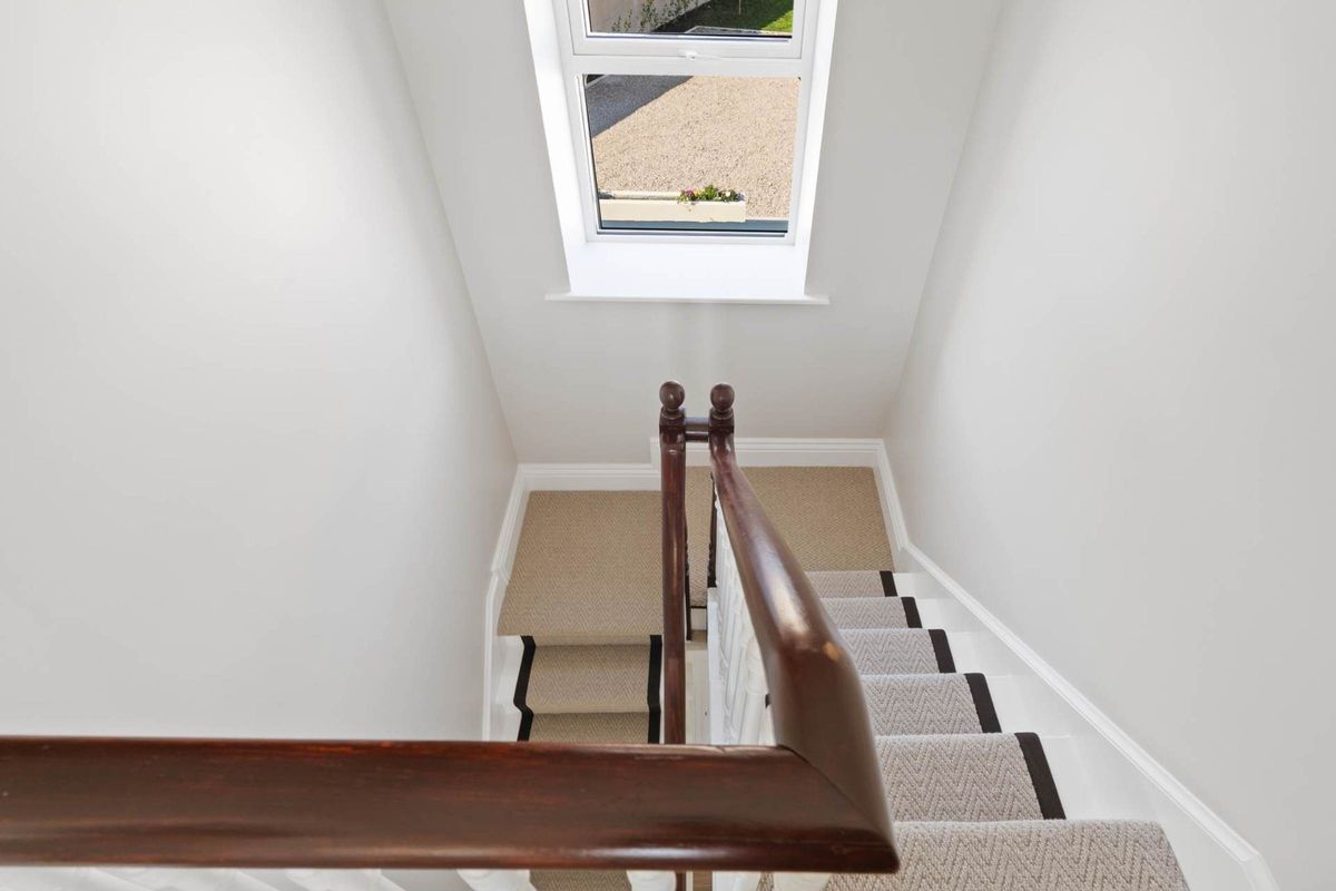The original period staircase with a beautiful new carpet runner, leading to the first-floor landing area. Filled with generous amount of natural light, due to the high ceilings and large windows. The first floor also has air to water and contemporary energy saving aluminium radiators.