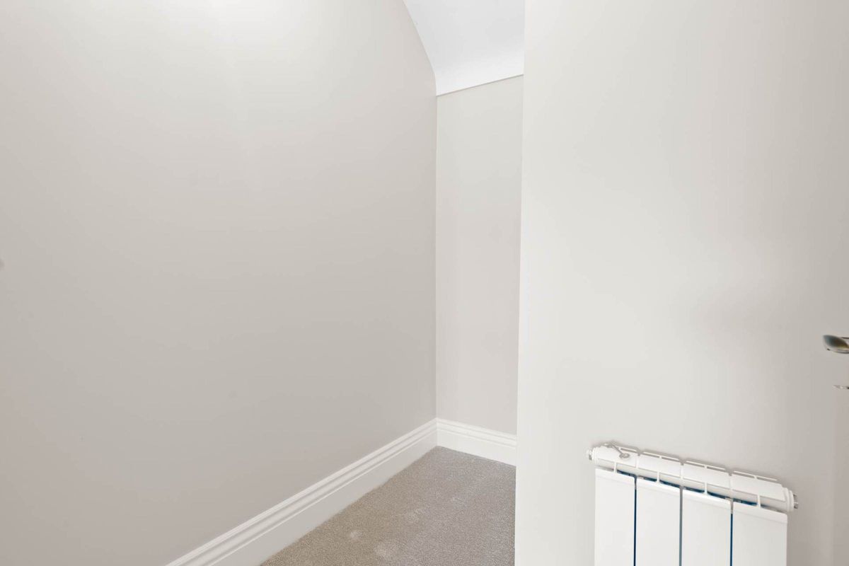 Bedroom one: 3.96m x 3.34m with carpet flooring and high ceilings. There is a walk-in closet with a contemporary aluminium radiator and an individual thermostat to control the temperature.