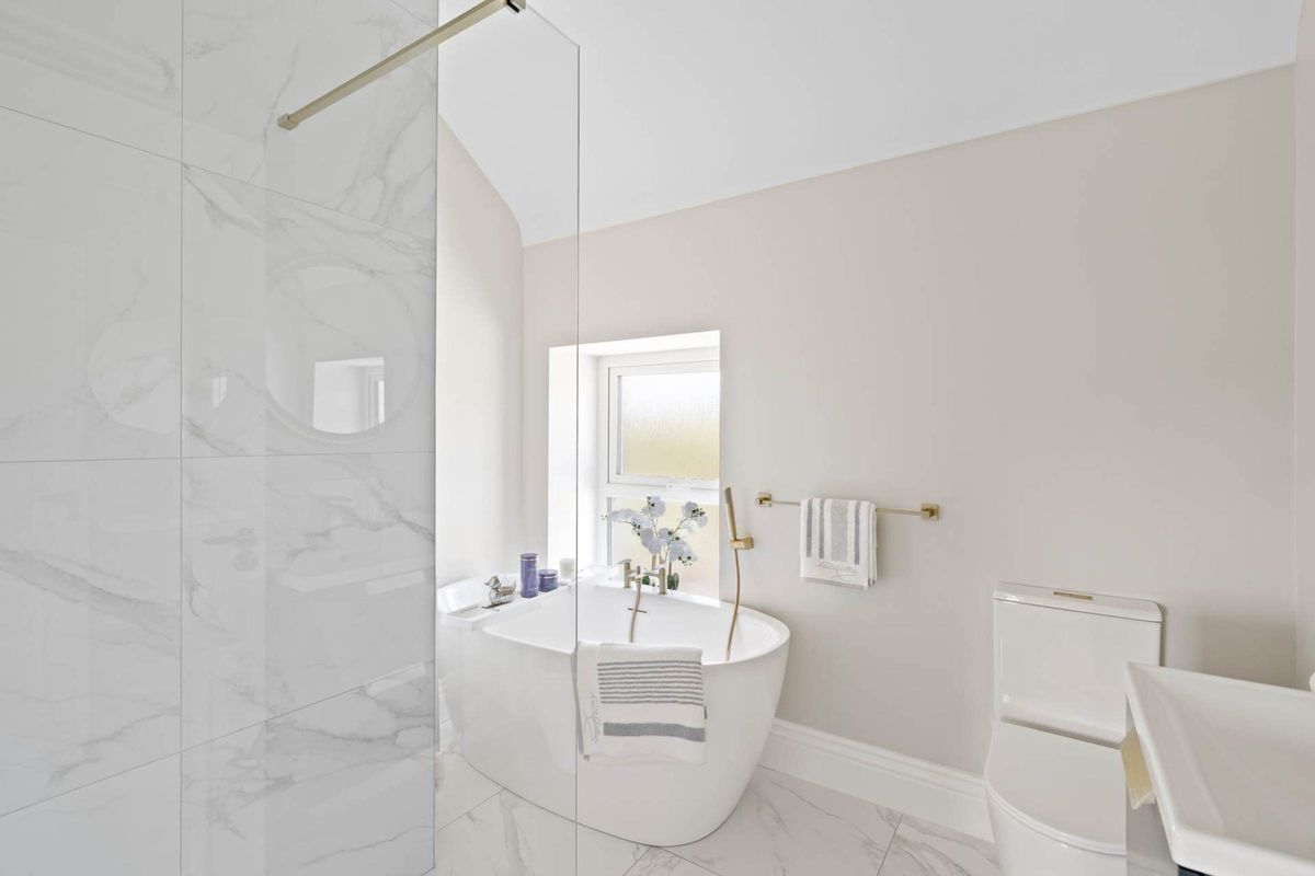 First floor main bathroom: Contemporary tile flooring and a contemporary white three-piece suite. There is a free-standing feature bath, with brass fittings. Separate shower cubicle with brass fittings and a mains power shower. The contemporary wash hand basin has storage below and above, an electric mirror has been installed which has sensor lighting and a heated towel rail.