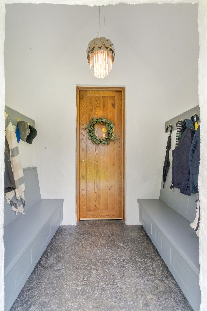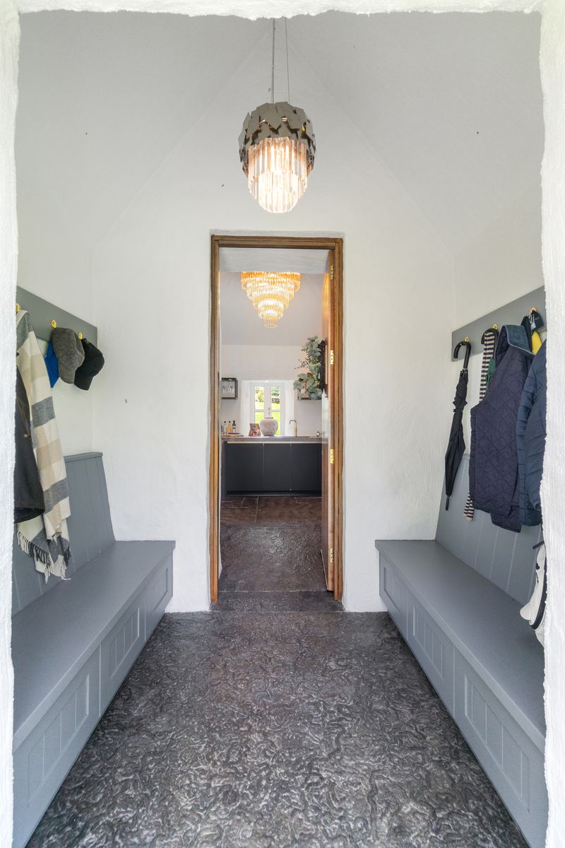 – Fine high Entrance Porch, with bespoke wooden storage benches, leading directly into