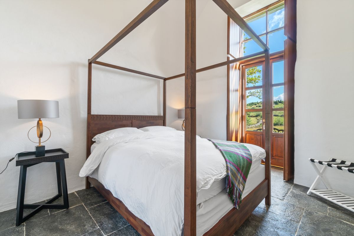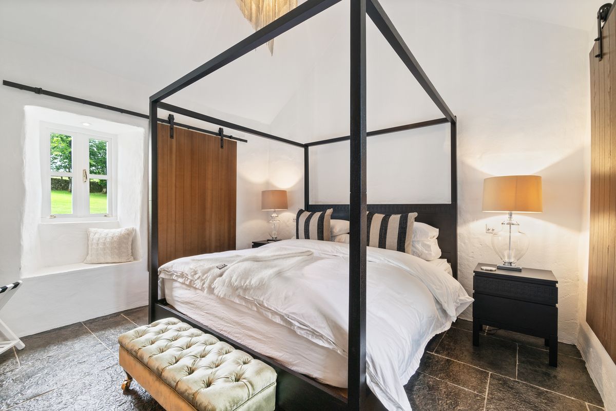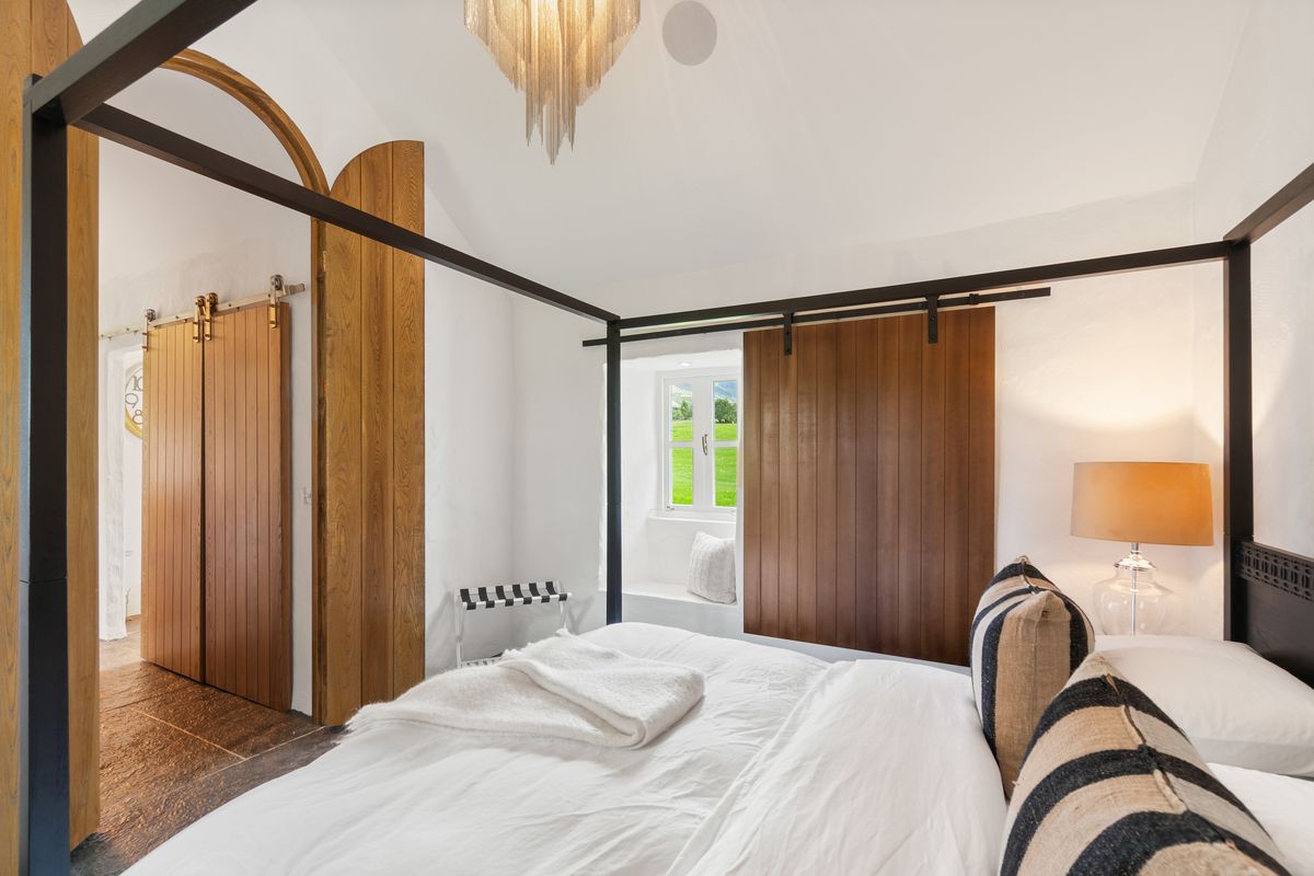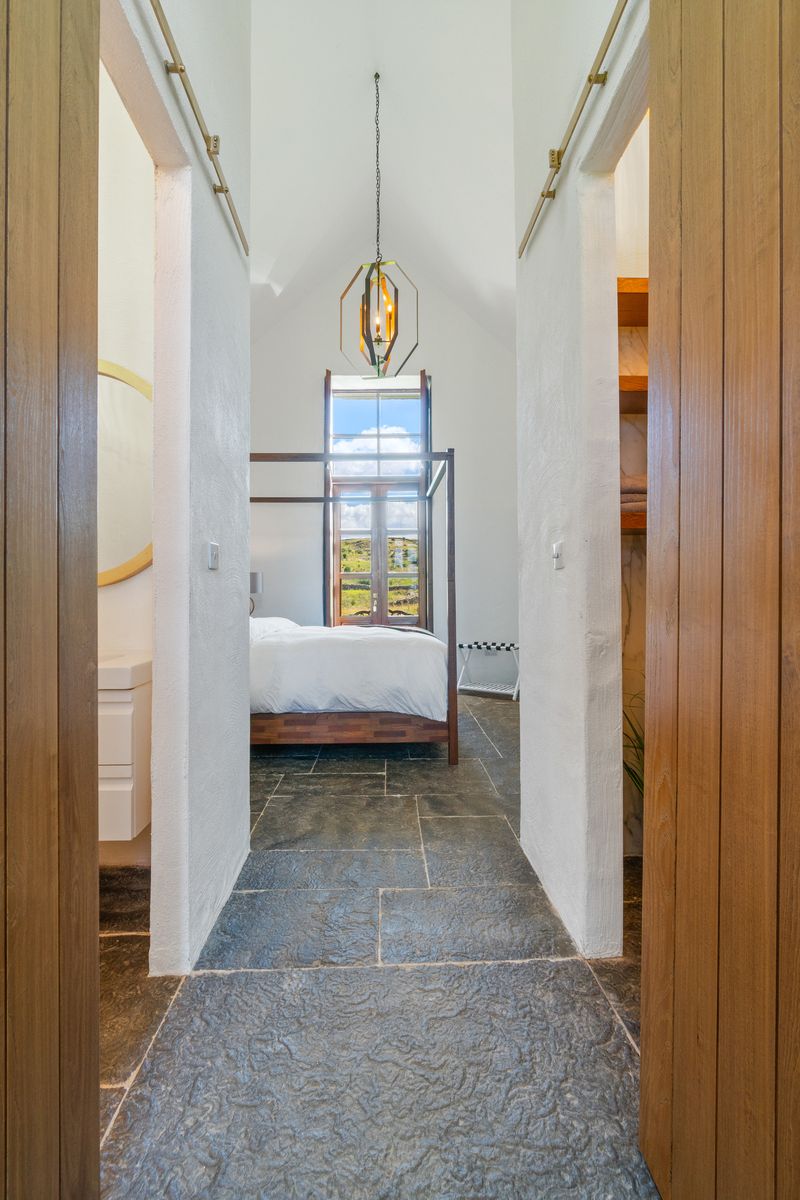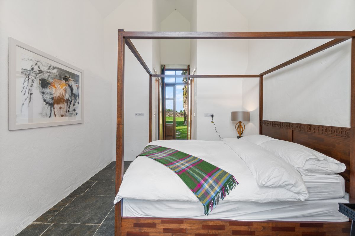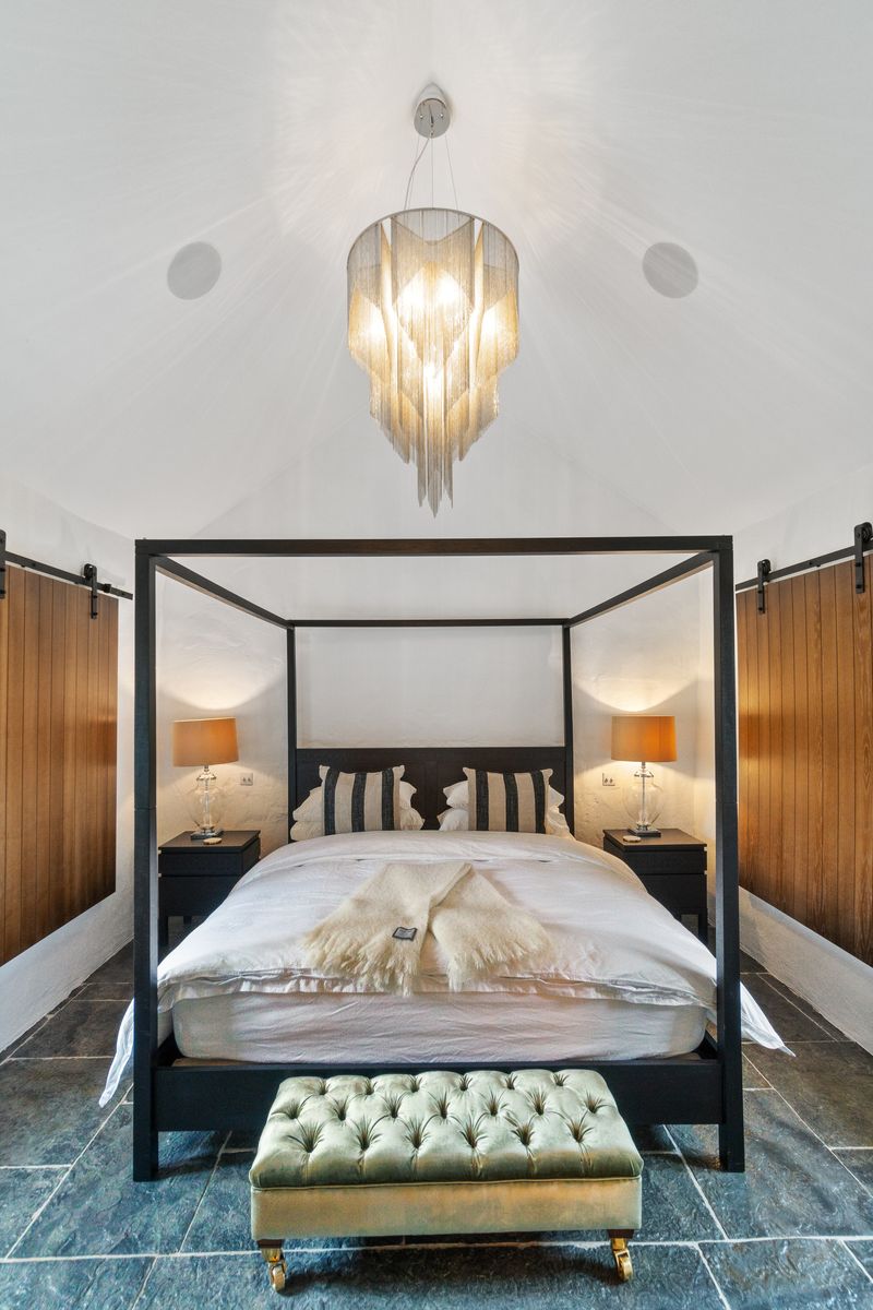 – Double Height Master Bedroom with four poster double bed, matching bedside tables with lamps, Chandelier, Walk-in Wardrobe with wooden shelving. Liscannor stone floor.