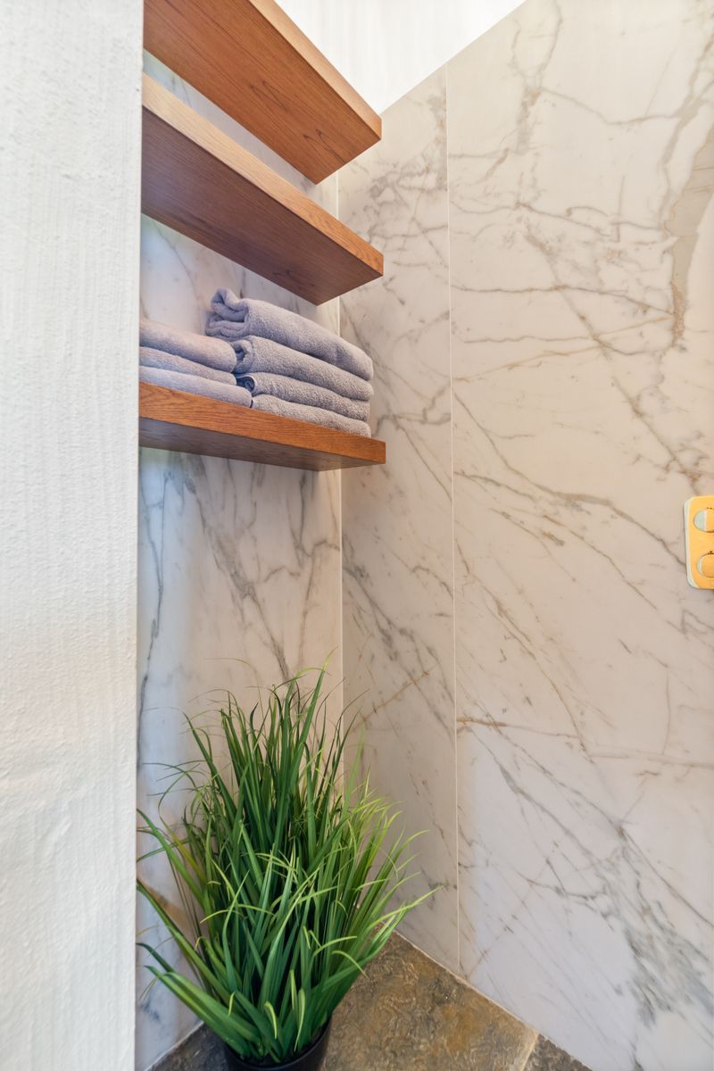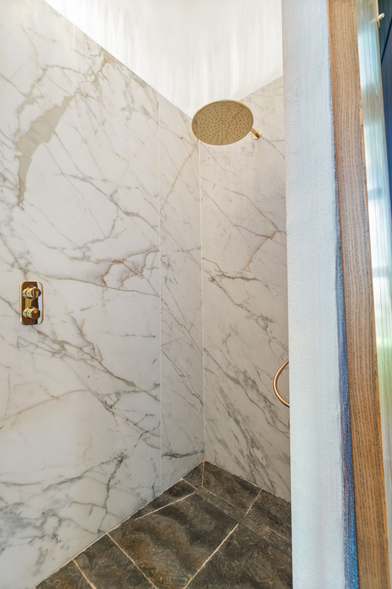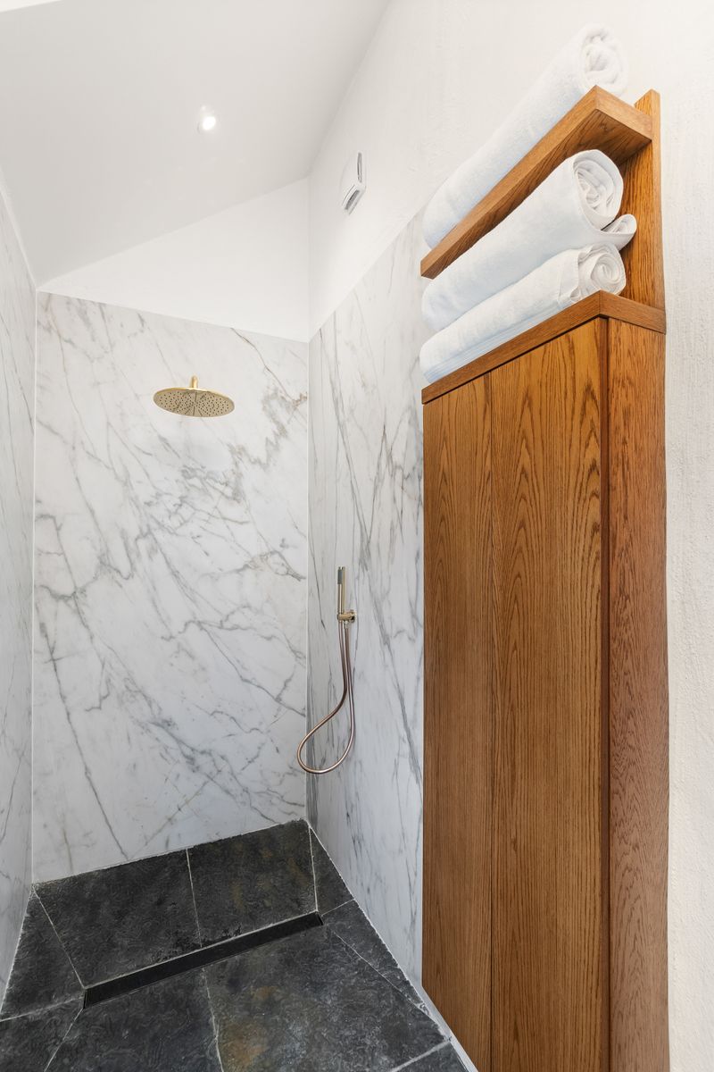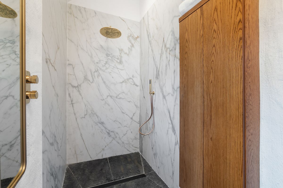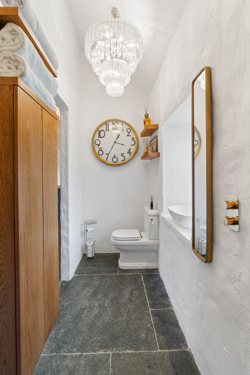 – Shower Room with marbled walls, chandelier, WC and WHB, wood shelving and presses
