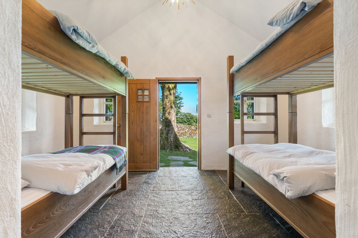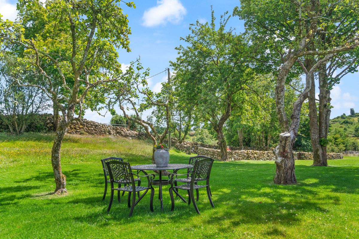 The property is bound by traditional stone walls and is accessed via a gated entrance with parking, and pretty stone paths picked out through the lawns.