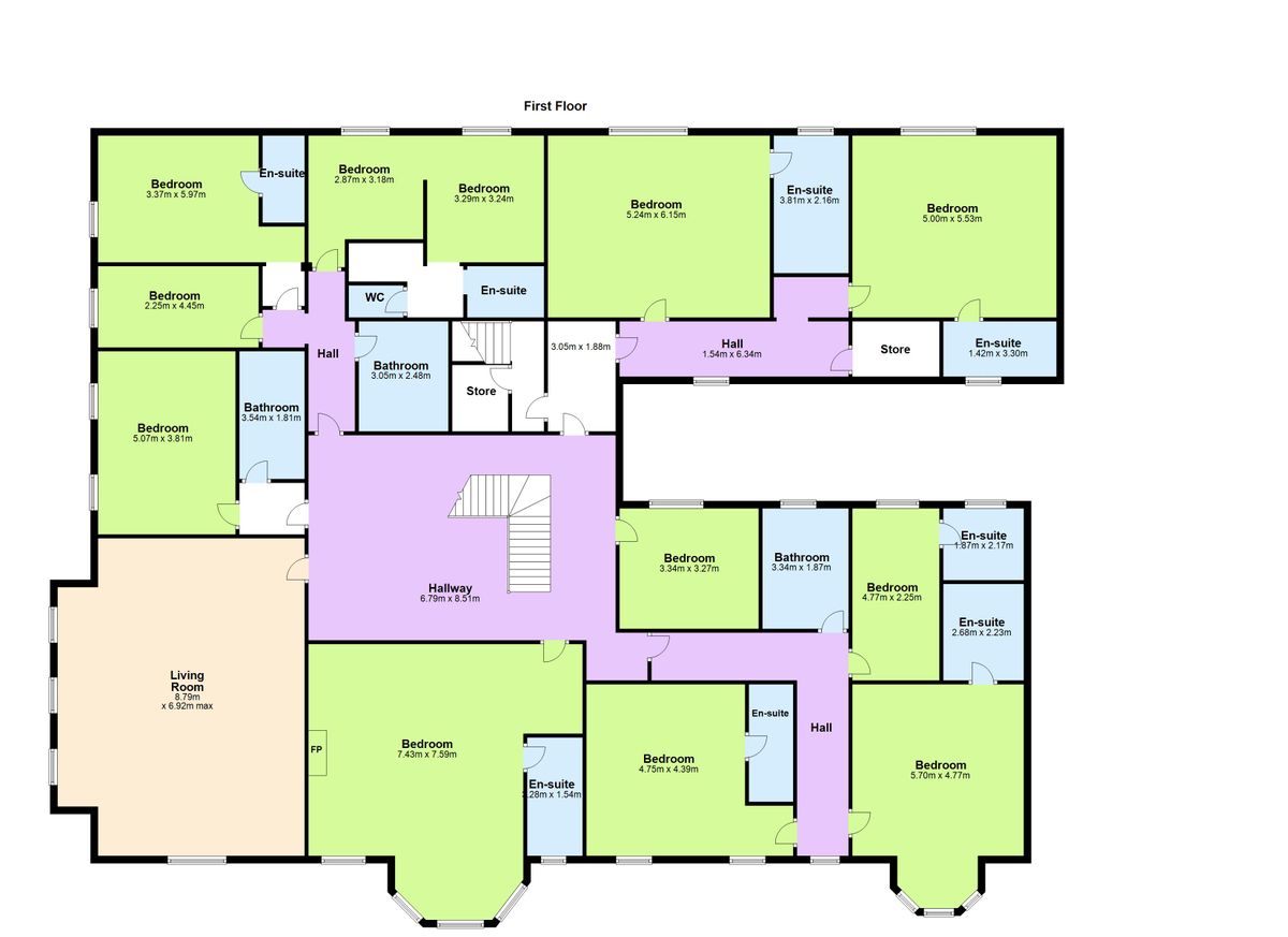 An elegant and spacious Drawing Room overlooking the river, with period fireplace and attractive shuttered windows is located on the First Floor. This is a gracious and tranquil setting in which to relax and unwind in the warmth of an open fire. The First Floor boasts twelve bedrooms, eleven of which are en-suite and the other with private bathroom. Each bedroom is uniquely designed and sized, offering varying views of the river and grounds.