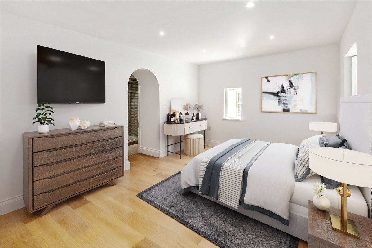 Upstairs, three double bedrooms offer built-in wardrobes and elevated views over the water, while the luxurious family bathroom includes a deep standalone tub and separate shower. Throughout the home, bespoke hardware and refined finishes reflect the quality of the restoration.