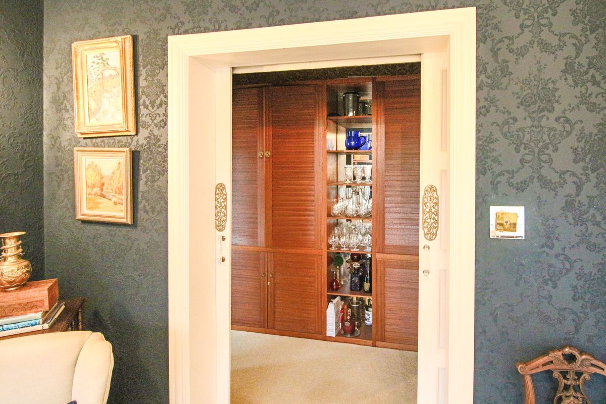 An exquisite room with wool/silk carpet, dark cobalt damask wallpaper, a curved, fully glazed wall feature illuminates this elegant room with natural daylight and most pleasant garden views. This glazed section also incorporates two glazed doors providing direct access to external terrace and gardens. Coving & centre roses x 2, flanking fitted bookcases to both sides of entrance doors, Gränsö crystal glass chandelier, bronze wall sconces, marble chimney piece with brass inset, marble hearth and carved, gilded over mantel, sliding doors bronze & crystal fittings. Off the dining room is a seamlessly recessed bar 2.90m x 1.20m, fully fitted with mahogany cupboards & display units, crystal & bronze pendant light fitting.