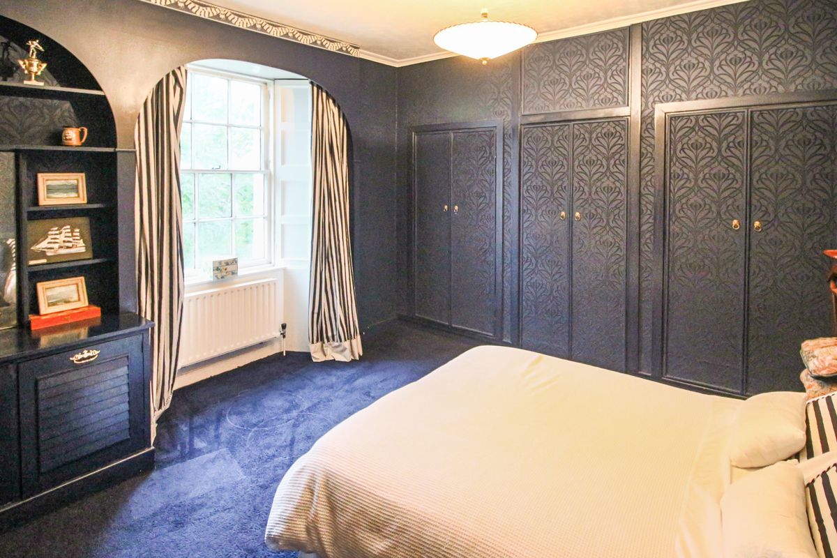 A beautiful bedroom with feature curved windows overlooking gardens, wallpaper, carpet, pelmet & drapes, radiator, ceiling light fitting.