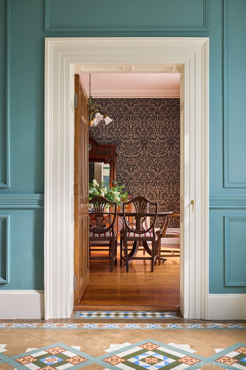 The entrance hall sets the tone for the rest of the house. Upon entering the glazed panelled timber front door with over light, one is greeted by the intricate Victorian encaustic floor tiles, floor to ceiling effect wainscoting, ornate cornicing and ceiling medallion which leads to the striking feature staircase.