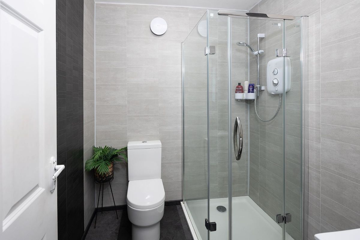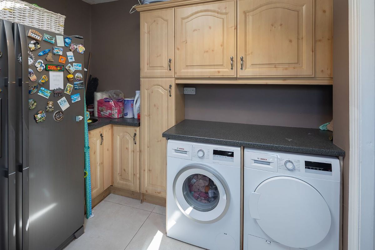 On entering, the hallway immediately showcases the tasteful blend of old and new. To the front, the main sitting room boasts a bay window, wooden flooring, and a feature fireplace. A second reception room with an electric fire provides further living space, leading seamlessly into a bright sunroom and the heart of the home — the modern kitchen. Complete with a large island, ample storage, and adjoining utility, this is a perfect space for family gatherings. A generous downstairs bathroom with shower completes the ground floor.