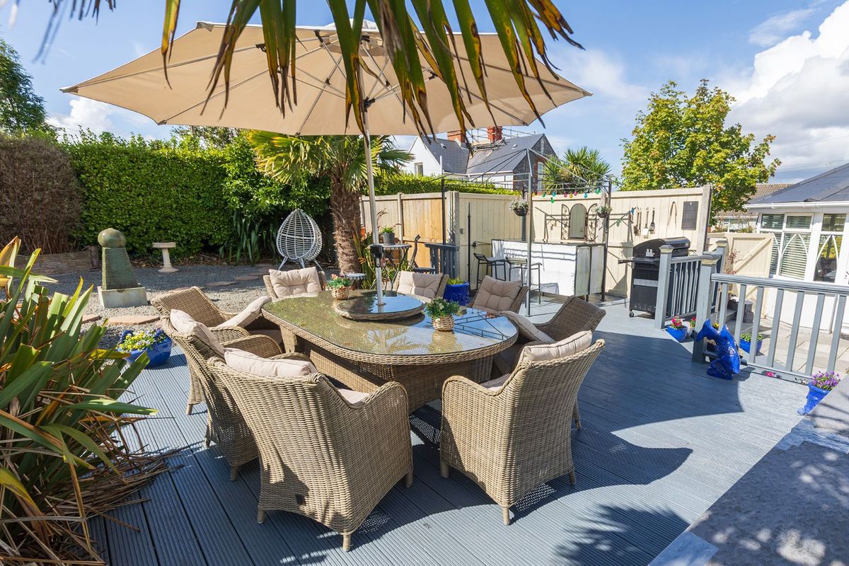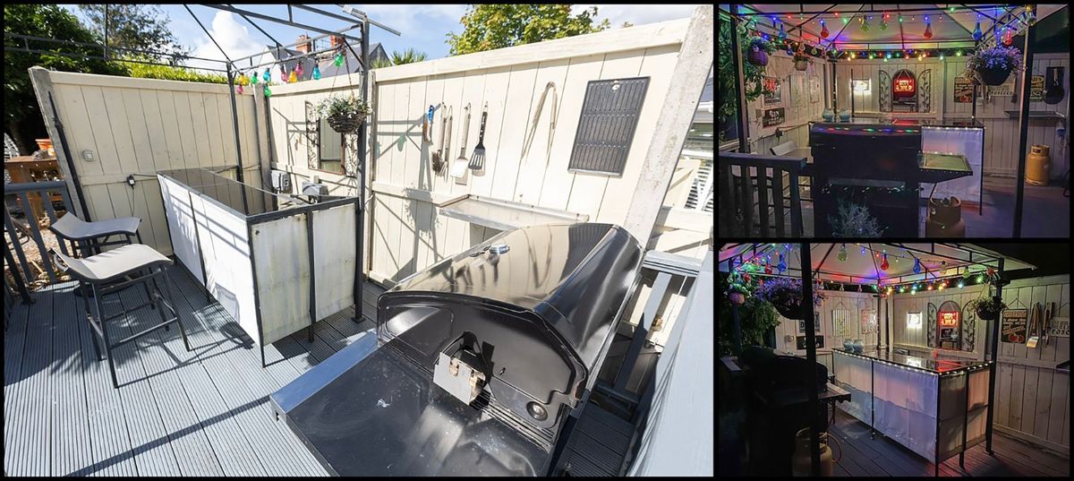 – South-facing rear garden with decking, barbecue area, and workshop shed
