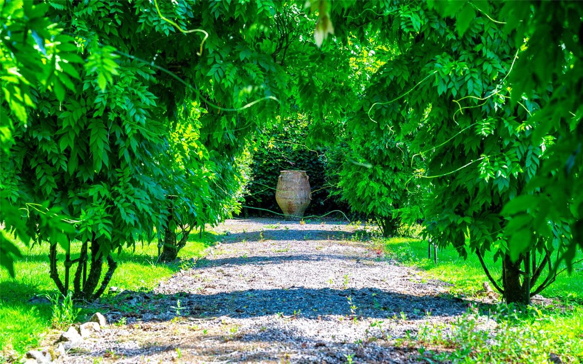 Accessed via a beautiful gated entrance and a long avenue, the house is ideally positioned at the centre of the estate for maximum privacy. A charming one-bedroom gate lodge sits near the entrance, and a large gravelled forecourt provides generous parking. The grounds are adorned with mature trees, manicured lawns, a full-size tennis court, and a stunning garden with a greenhouse. Just beyond the Beech hedge walled garden, extending to the tree lined property boundary there is a woodland which has a carpet of bluebells every spring.