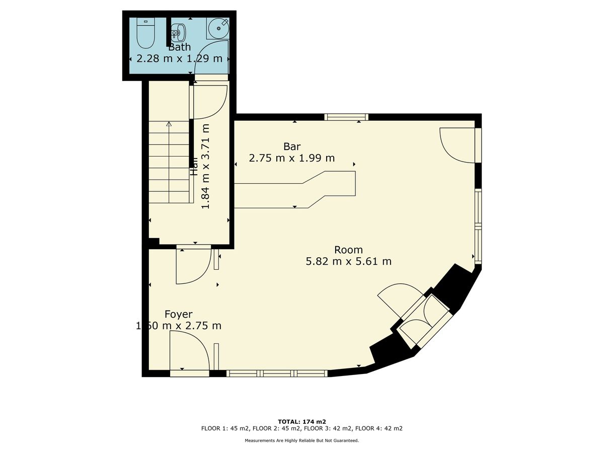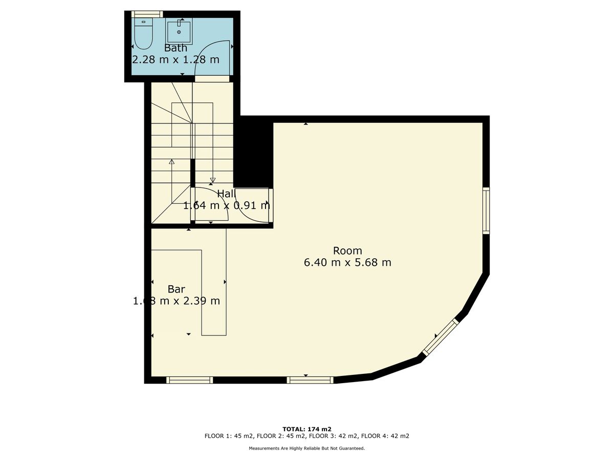 The building spans four stories and includes an active cellar for convenient keg and drink storage, accessible from both inside the pub and directly from the road. Inside, the pub boasts a unique semi-circular design, creating a cozy and charming atmosphere. Original features like stained glass windows, the countertop, and flooring add to its character.