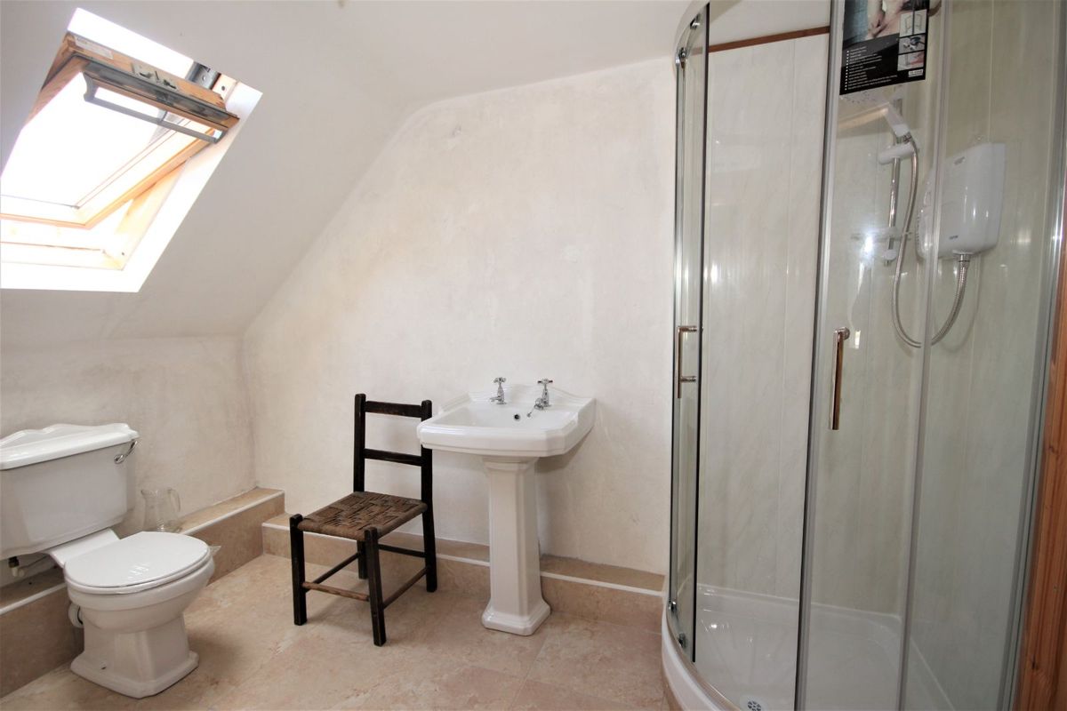 Bathroom 1, 2.35m x 1.74m: shower, w.h.b, toilet, coving, wooden floor, access to hallway and bedroom