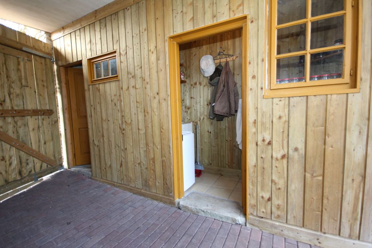 Kitchen/Dining Area, 4.30m x 5.61m: wooden floors, wooden panel walls and ceilings, curtains, entrance door, kitchen units, pellet stove
