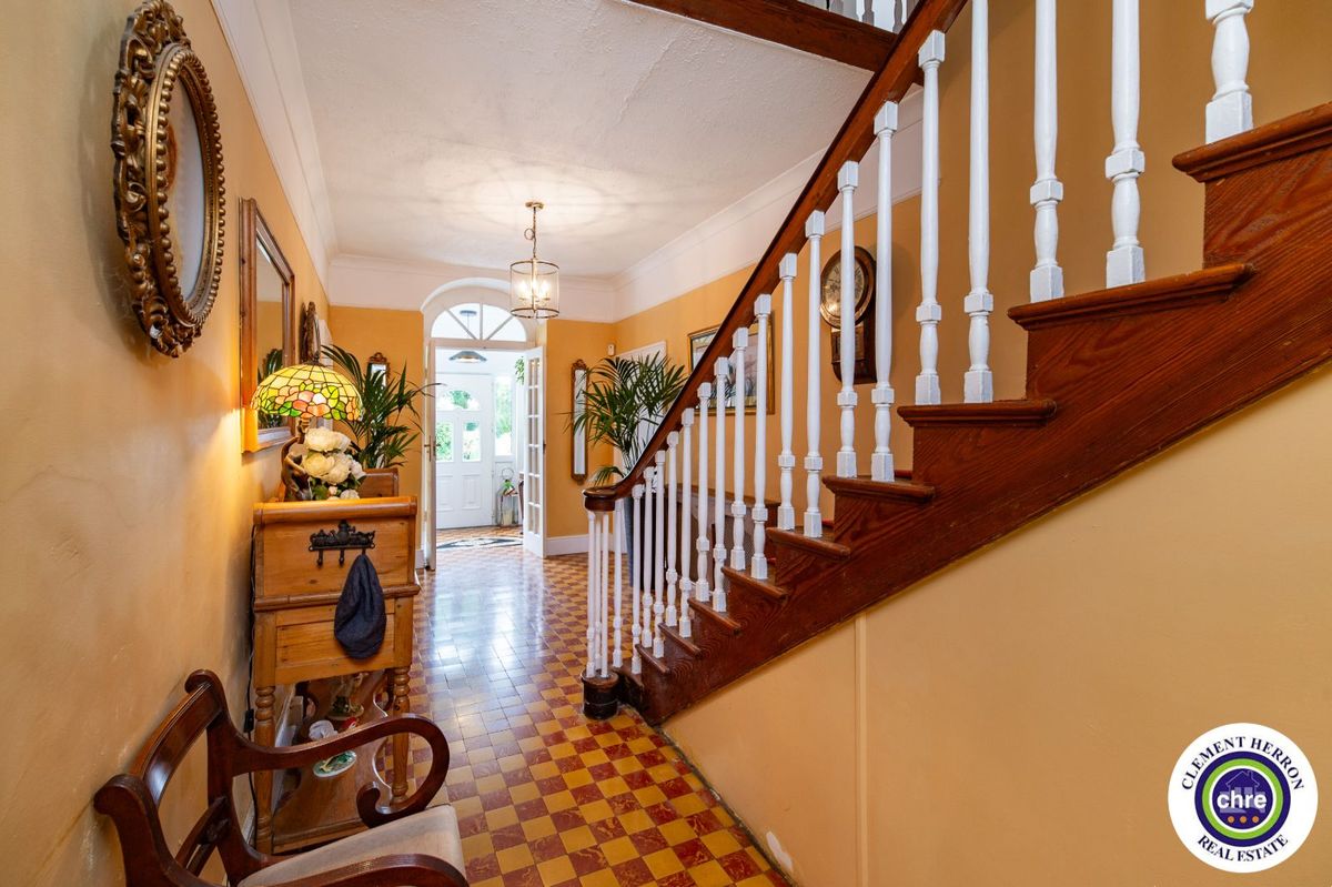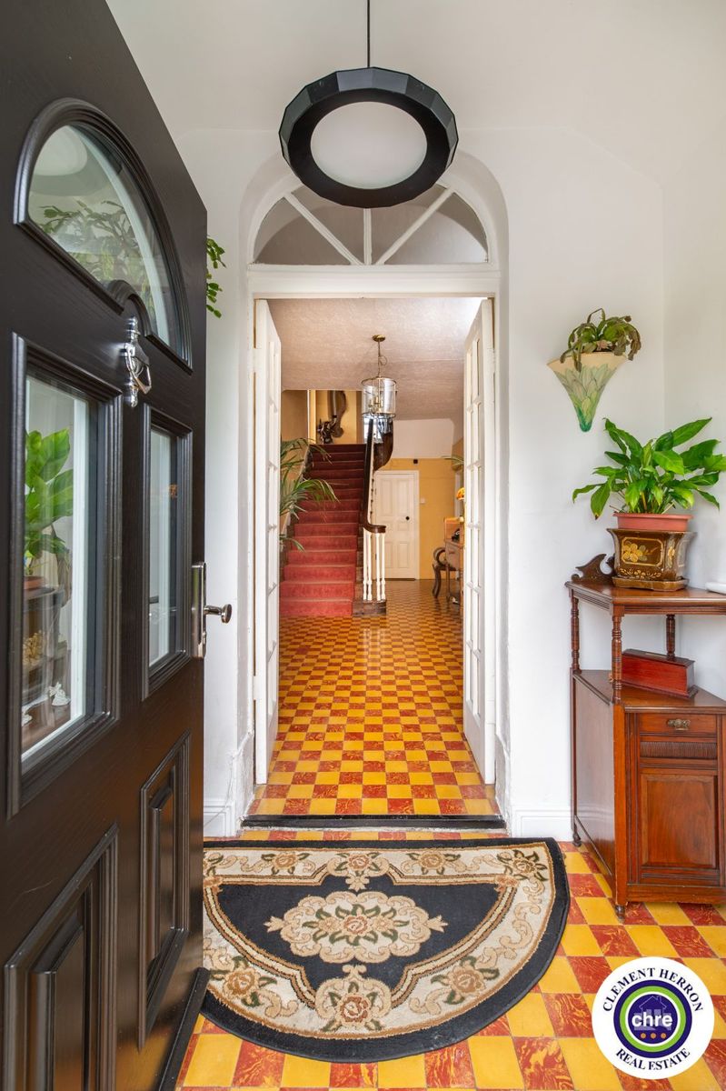 The current accommodation spans two floors and includes a charming storm porch leading into an elegant entrance hallway with original Georgian tiled floors, high ceilings, and double doors into the main living spaces. The sitting room and formal dining room sit to either side, both bathed in natural light, feature fireplaces, and ornate coving still in place.