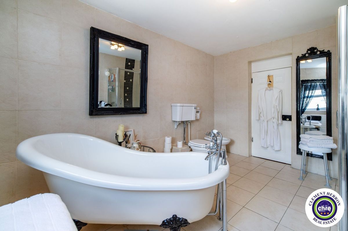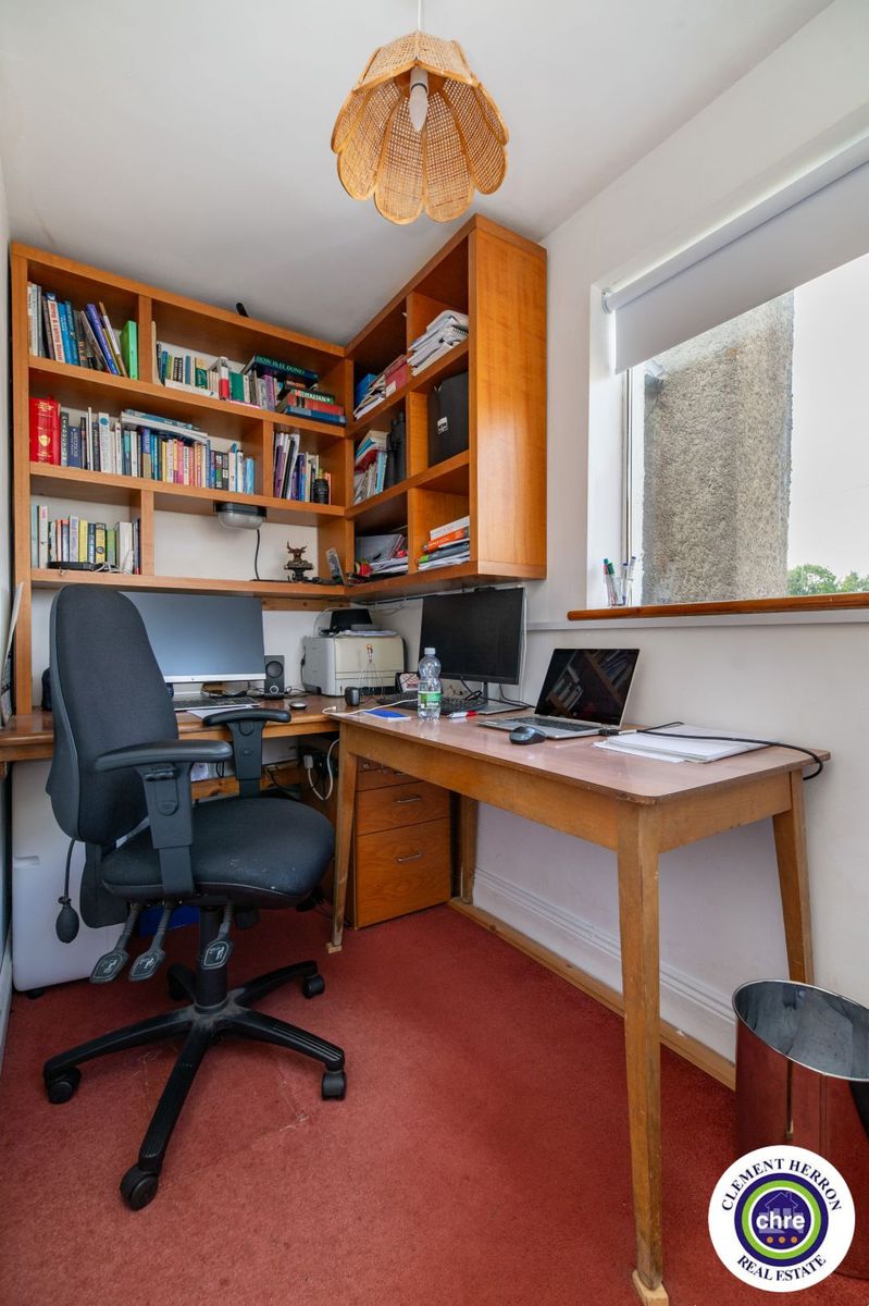 To the rear of the house is the kitchen and dining area, a warm and inviting space that leads to a ground floor guest w.c. A standout feature of the home is the broad half-turn staircase which gracefully rises to the first floor. The landing offers a true sense of space and leads to four generously sized bedrooms, each full of character and light, along with the main bathroom, which retains the traditional elegance in keeping with the period style. The home is heated via oil-fired central heating and also benefits from a solid fuel stove for added comfort.