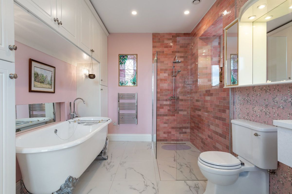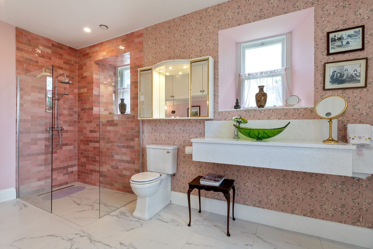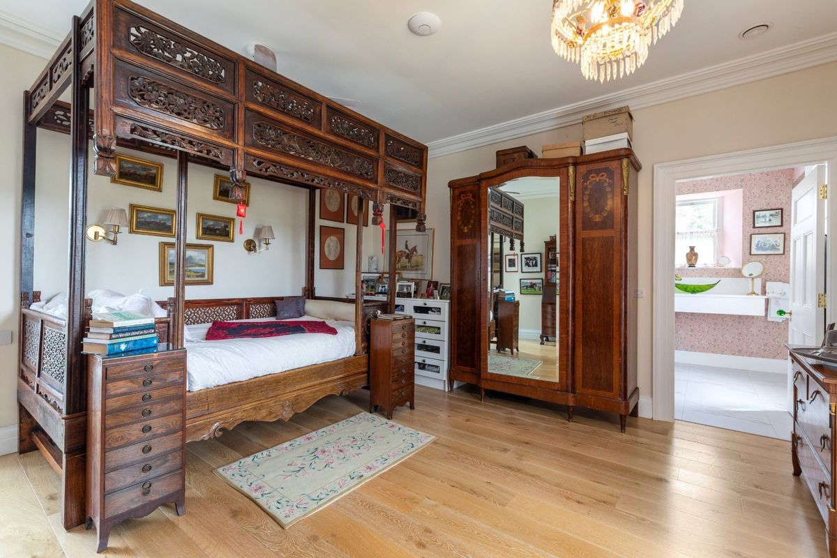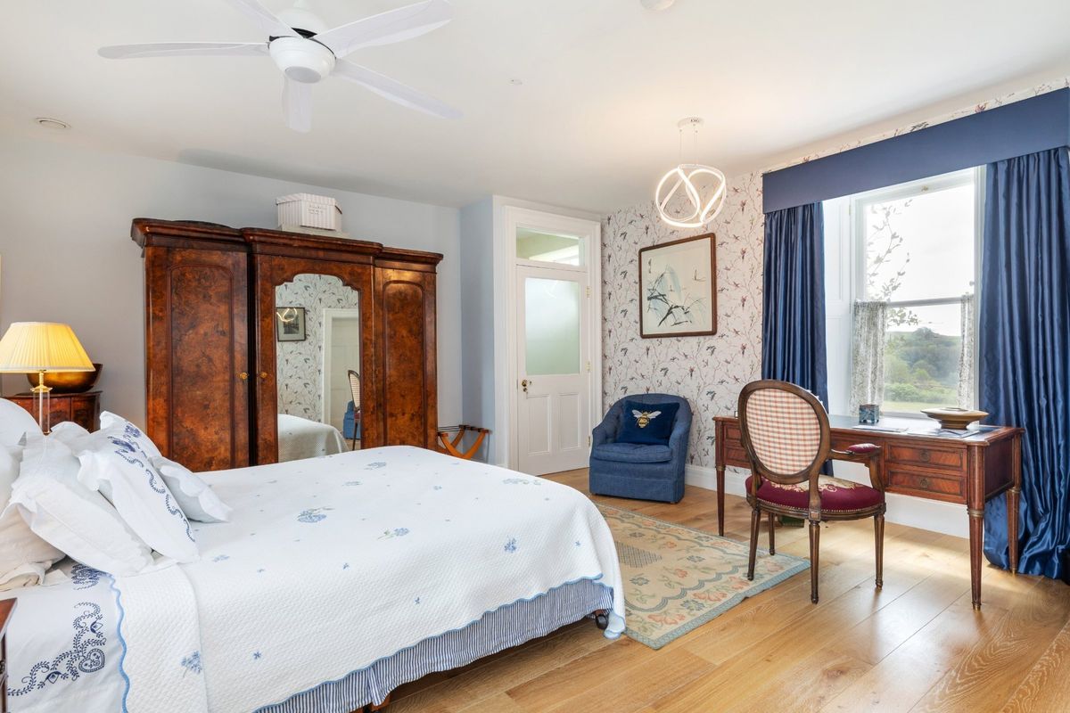 A stable half door opens to the courtyard, establishing a fluid connection between indoor and outdoor spaces. The original farm house includes two spacious ground-floor bedrooms, each of which is complemented by ensuite bathrooms, both thoughtfully designed to be wheelchair accessible. They are elegantly finished with bespoke cabinetry and feature one luxurious freestanding clawfoot bathtub. The bedrooms can be conveniently accessed through the conservatory hall, creating a seamless flow throughout the space. Both bedrooms have access to a private door which would have been the original front door opening directly to the garden, offering breathtaking views of the lake. This serene outdoor space includes a full croquet lawn, meticulously maintained to professional standards, providing an ideal setting for leisurely afternoons.