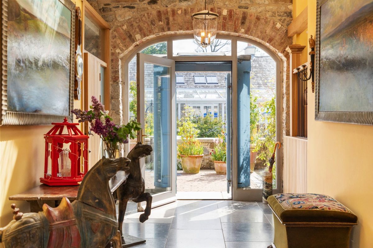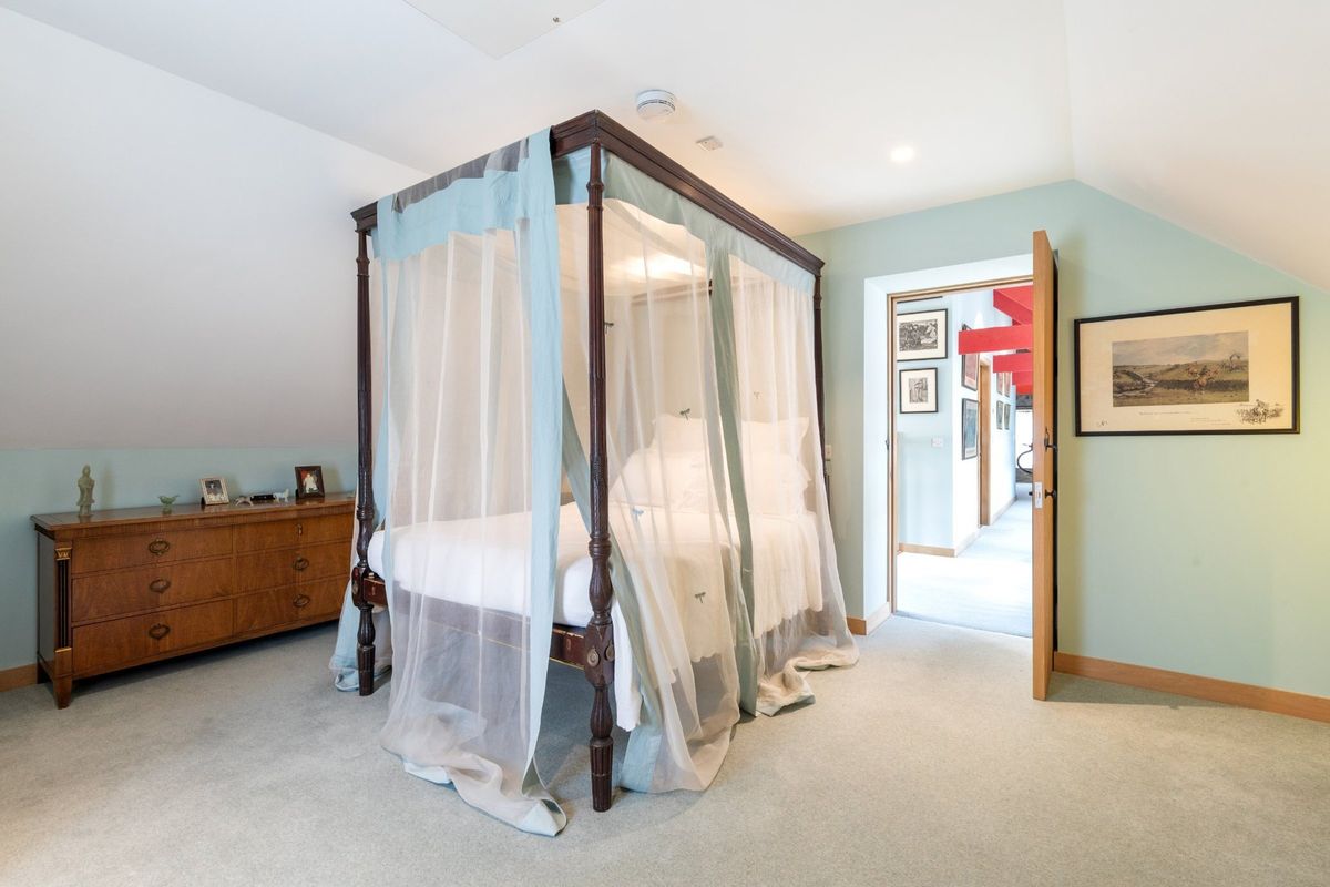The Main House, originally a 19th-century farmhouse, is accessed through the former West Barn, entered through reclaimed Indian temple doors. Inside, the entrance hallway features barn railing, solid oak doors, original exposed stonework, and tiled floors, setting the tone for the refined interiors. The centrepiece of the converted barn is now an expansive open-plan living space with vaulted ceilings, original beams, electric skylights, and a striking hand-painted voile ceiling art installation by artist Patty Hudak. Titled ‘Sailing to Byzantium,’ (suggested by the poem of the same name, by William Butler Yeats) the voile creates a sail-like effect when the skylights are open, adding a dramatic visual dimension to the room. This living area includes bespoke cabinetry, a dining area with most of an original apothecary bookcase and library lighting, and a kitchen fitted with stone countertops, a Belfast sink, integrated gas and electric ovens, in the classic AGA range.