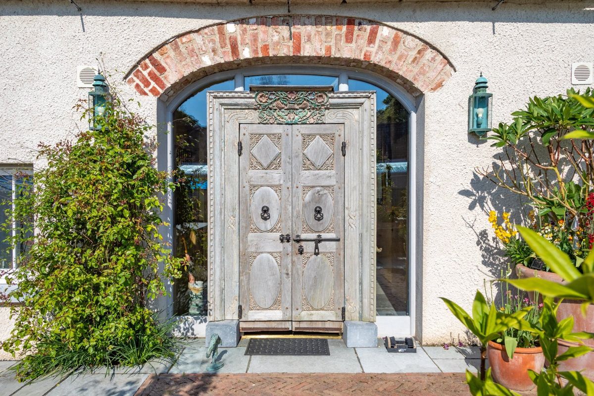 – Courtyard with reclaimed Indian temple doors and landscaped quadrangle with a wall fountain, herringbone brick flooring and an ornamental well designed by Catherine FitzGerald and Mark Lutyens and planted by Ralph Wickham.